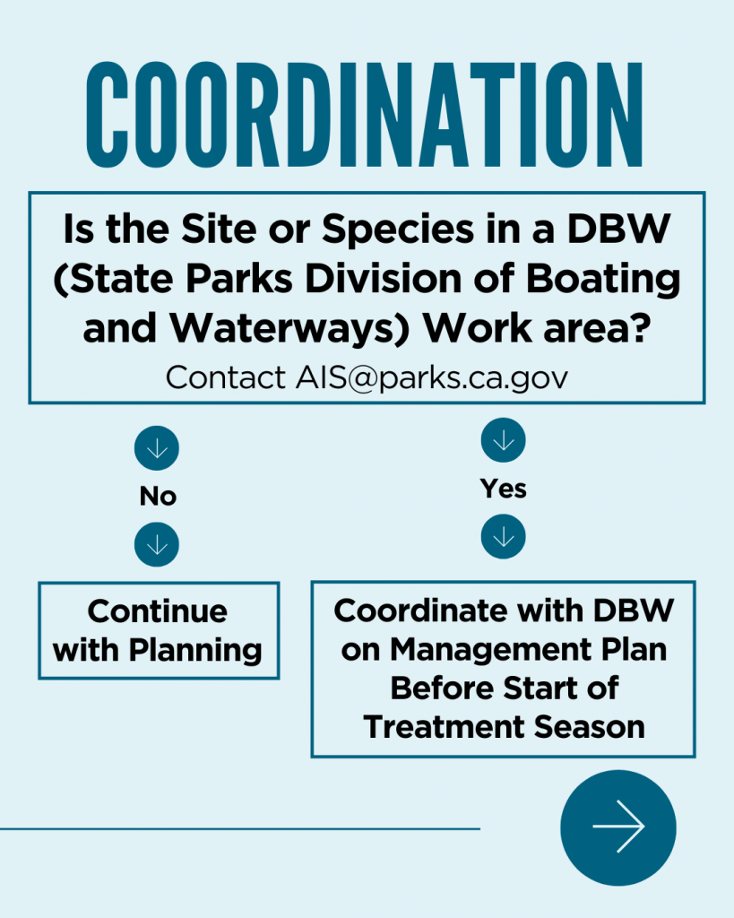 A fast response to a new invader is not possible without the preparation of an action plan, which includes how you will communicate and coordinate with relevant actors and a way to quickly bring together resources for action. One of the key elements of being prepared is having a plan; Cal-IPC’s Land Manager’s Guide to Developing an Invasive Plant Management Plan is a useful reference. Another key aspect of preparedness is developing a list of species likely to invade your site. CalWeedMapper and CalFlora’s What Grows Here can be useful tools for this planning. If you have jurisdiction and ability, treating nearby sites could limit propagule pressure for your site and be an effective part of your broader plan.