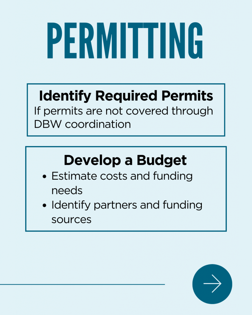 Depending on the size and location of your site and the control methods you choose, different permits may be required. Each permit has an associated cost and required amount of lead time for approval. This guide provides an overview of many commonly required permits. However, it is the responsibility of each project proponent to ensure all needed permits and environmental compliance actions are complete.